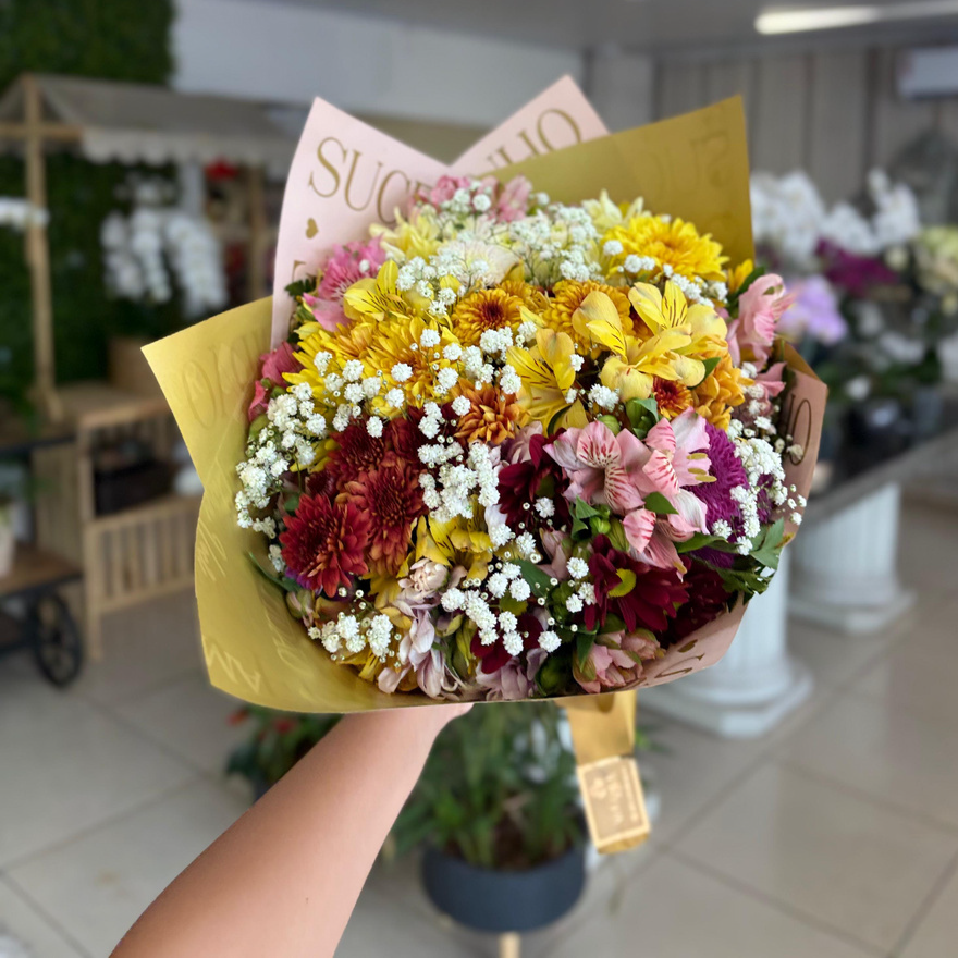 Nossos arranjos exclusivos são produzidos com flores mistas frescas, devido a isso, flores e embalagem podem variar, sem que seja afetado o padrão da composição.